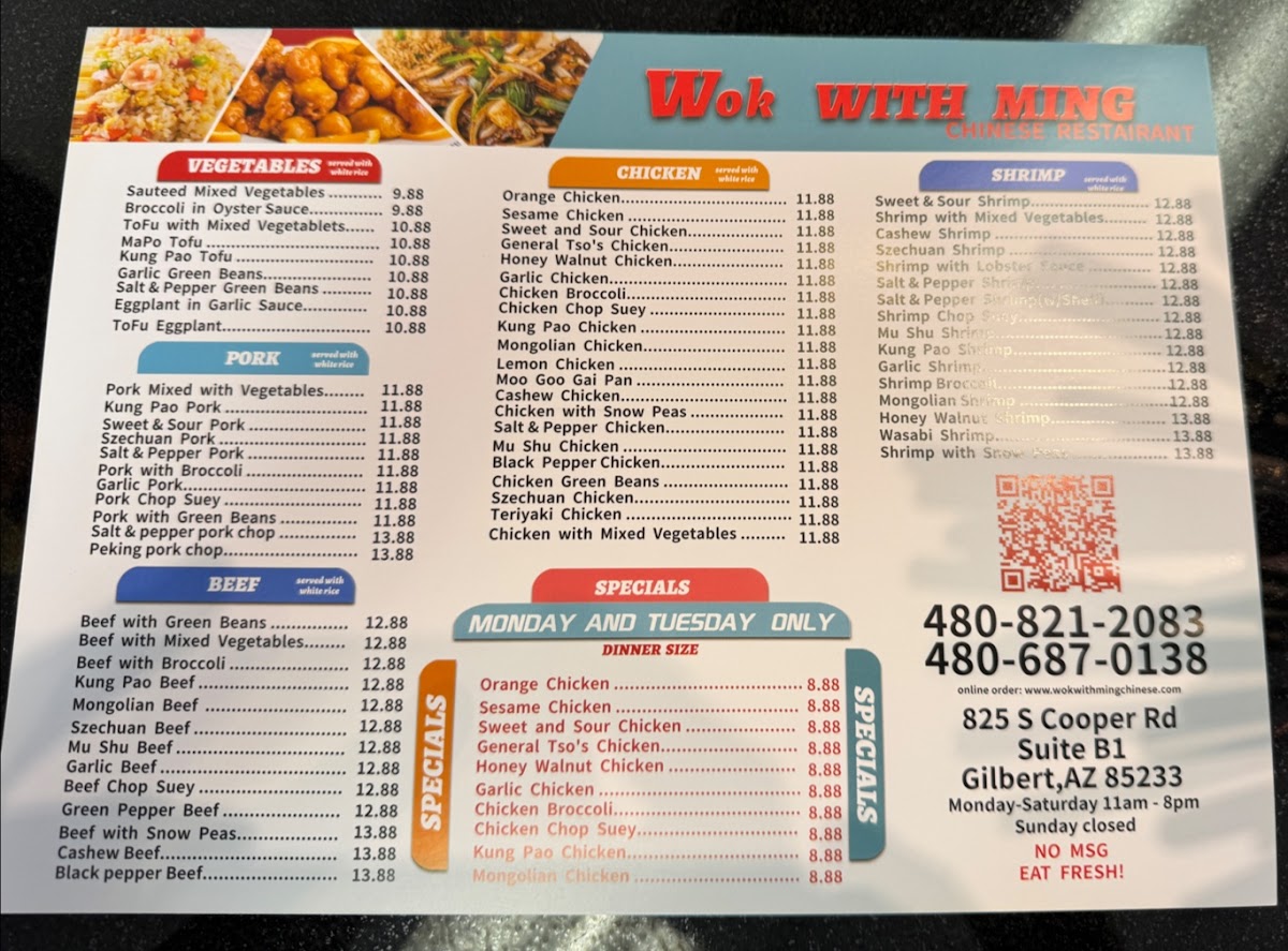 If you’re on the hunt for authentic Chinese cuisine that feels like a warm hug from your grandmother, look no further than Wok with Ming, a hidden gem nestled in Gilbert, Arizona. Located at 825 S Cooper Rd B1, this charming spot is perfect for both quick takeout and a cozy dining experience, boasting a welcoming atmosphere that feels both personal and friendly.